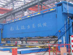 船用三輥對(duì)稱式卷板機(jī)結(jié)構(gòu)型式為三輥對(duì)稱式,上輥在兩下輥中央對(duì)稱位置作垂直升降運(yùn)動(dòng),通過(guò)液壓缸內(nèi)的液壓油作用于活塞桿而獲得,為液壓傳動(dòng);通過(guò)特殊設(shè)計(jì)減速機(jī)分別帶動(dòng)全滾動(dòng)軸承的兩下輥?zhàn)餍D(zhuǎn)運(yùn)動(dòng),為卷制板材提供扭矩;在下輥下部設(shè)有多組托輥,以提高下輥的剛度,并可進(jìn)行垂直調(diào)節(jié);在上輥的上部設(shè)有剛性大梁,在大梁與上輥之間設(shè)有多組托輥,以提高上輥的剛度;適用于超寬圓弧形零件的卷制。可卷板厚3mm-50mm,板寬21000mm的板料。